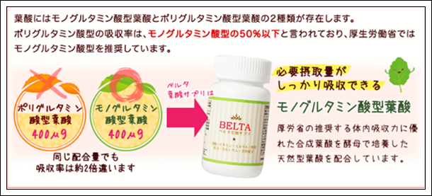 ベルタ葉酸サプリでは、天然型酵母葉酸(葉酸含有酵母)は厚生省が推奨する合成葉酸をさらに効率よく摂取できるように酵母で醗酵培養させた原料となっています。モノグルタミン酸型の葉酸を使用することで、吸収率が約2倍違います。